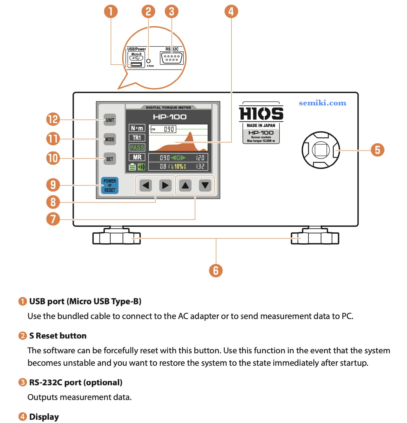 Data transmission: The HP-100-R3-W version has an RS232C port allowing connection and export of measurement data to a computer.