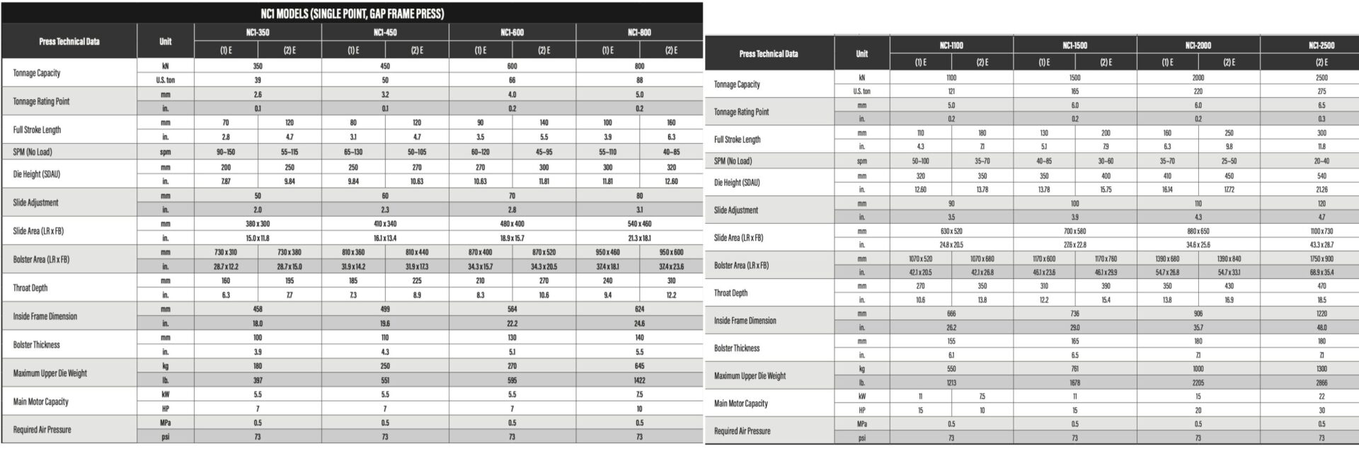 Máy dập AIDA Gap (Khung C) Dòng NC1-E là dòng máy dập cơ học được thiết kế cho dập kim loại đa năng, độ chính xác cao. Dòng máy này có công suất từ 35 đến 250 tấn.